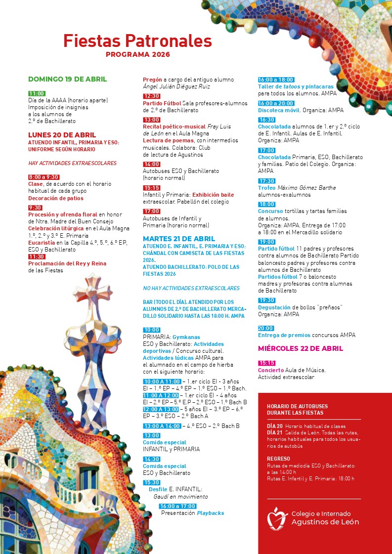 Las fiestas patronales del colegio se celebraran los días 20 y 21 de abril. El miércoles 22 hay clase normal de acuerdo con el horario lectivo habitual.